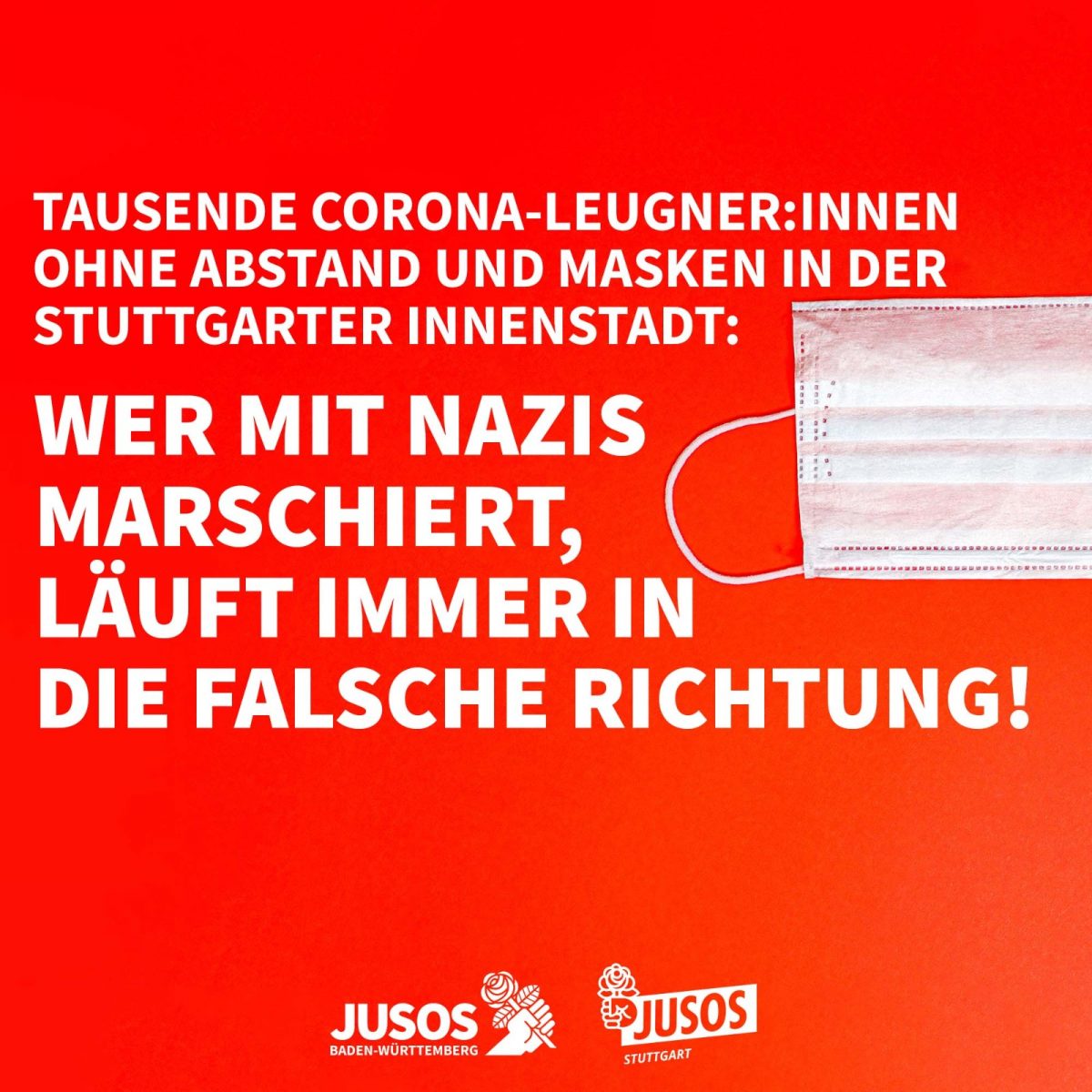 Stuttgart Rund 10.000 Menschen haben am Karsamstag in der Landeshauptstadt gegen die geltenden Corona-Vorschriften demonstriert. Jusos Baden-Württemberg und Jusos Stuttgart üben deutliche Kritik an den Protesten der sogenannten „Querdenken“-Bewegung.